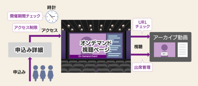 『こくちーずプロ』独自の「オンデマンド視聴ページ」を設けることでアーカイブ動画をいつでも、どこでも自分のペースで視聴していただけるようになっています。