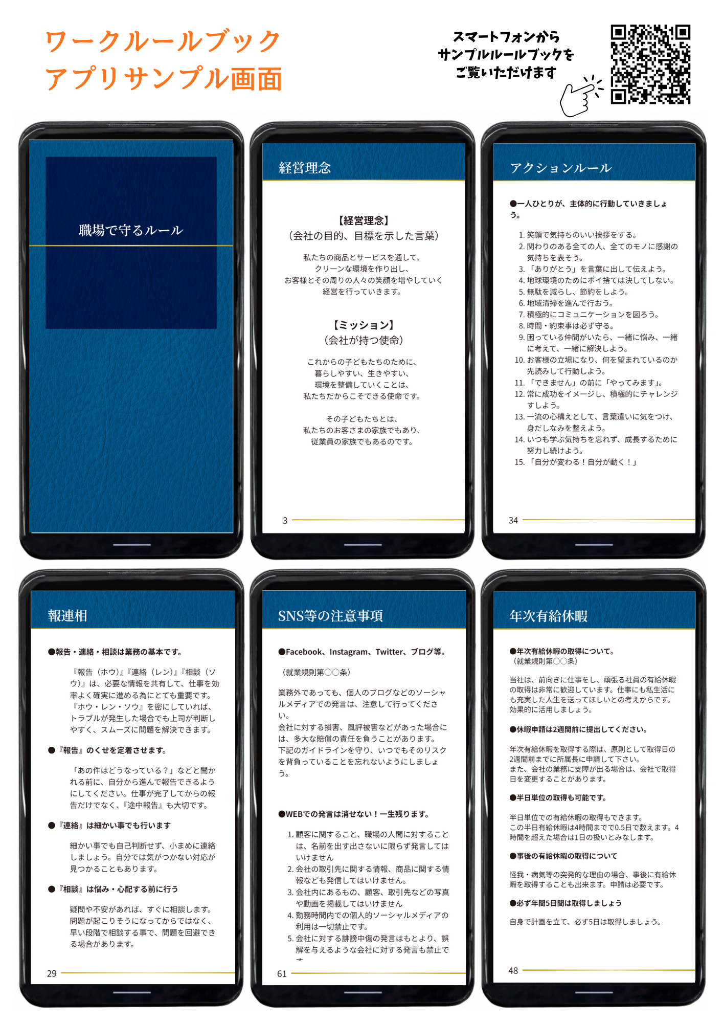 『ワークルールブックアプリ』では、会社の理念・行動指針・ルール・制度・Q&Aなどをひとつにまとめ、スマートフォンやPCからいつでも確認できます。