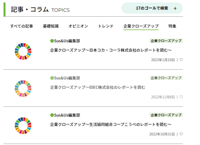 https://csr-toshokan.net/)に掲載された数千冊のCSRレポート等から、SDGsに関する取り組み内容をピックアップして紹介する「企業クローズアップ」も連載しています。