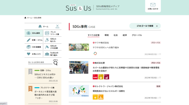 「Sus&Us-サスアス-」は、SDGsの普及促進、アイデアや取り組み事例などの情報発信、企業やNPO等への支援などを通して、持続可能な社会の実現を目指すWebサイトです。
