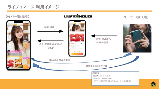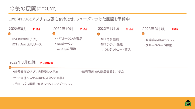 LIVER HOUSEは、暗号資産ウォレット機能が付いたライブ配信アプリです。その特徴を最大限に活かして、NFTの売買や暗号資産での投げ銭をアプリ内でできるようにアップデートをしていく予定となっております。