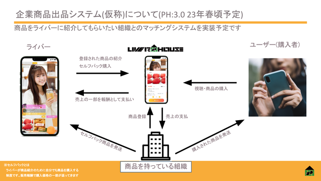 商品を持っていないけれど、ライブコマースに興味がある・稼ぎたいという人と、商品をライブコマースで販売したいけれどライバーがいないという企業のマッチングシステムを実装予定です。