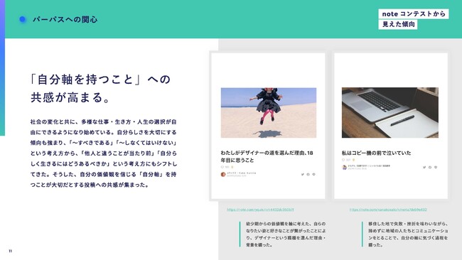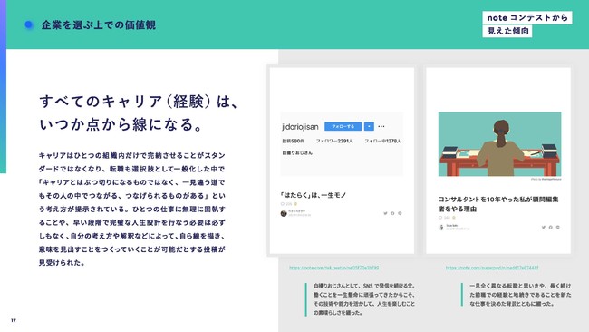 仕事や生き方が多様になり、人生の選択も自由にできるように社会が変化するとともに、仕事選びの軸にも変化が起きています。人や社会にどのような影響を与えたいかを考えている方、自分が大切にしている価値観を尊重して意思決定した方のエピソードに共感が集まりました。
