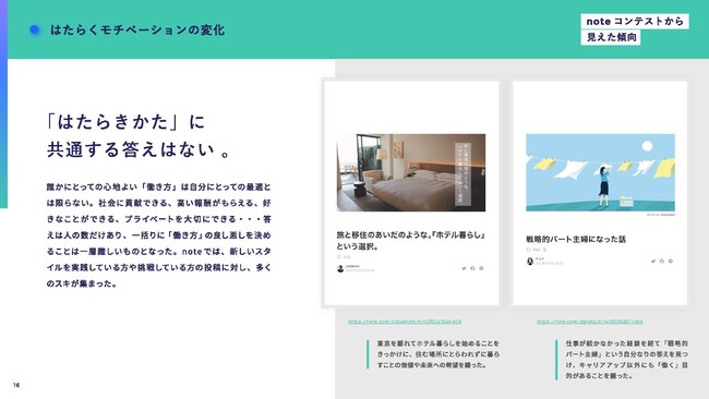 生活のため、好きなことのため、身近な人のため、あるいは社会のために。noteではこれまで「はたらく」にまつわるさまざまなエピソードが投稿されてきました。今回、そうした多くの生の声を参考にし、大量のデータに基づく調査とも違う、「想いを感じるレポート」へと仕上げることができました。このレポートが、読んだ人にとって自分なりのはたらき方・やりたいことを見つめ直す機会になれたら幸いです。さまざまな投稿をくださったnoteクリエイターのみなさん、本当にありがとうございました。