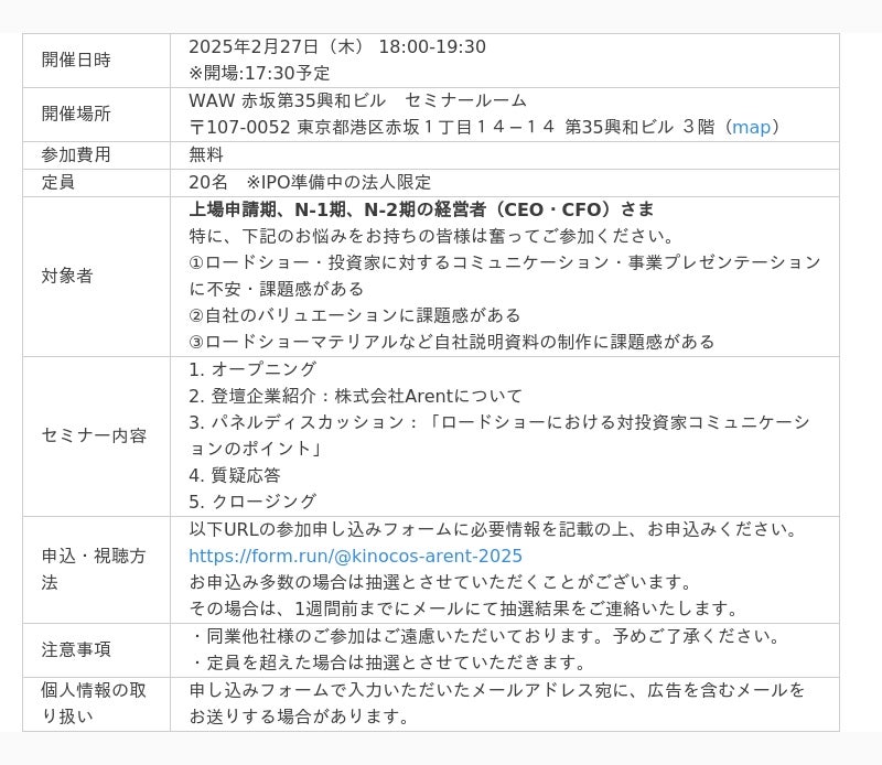 【2月27日(木) 18:00開催セミナー】KINOCOS、株式会社Arent(5254)代表取締役 鴨林氏を迎え「ロードショーにおける対投資家コミュニケーションセミナー」を開催