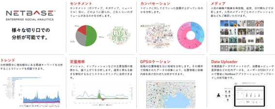 NetBaseは、米国で生まれた膨大なSNSデータよりリアルタイムに分析できるソーシャルアナリティクスツールです。すでにグローバル企業では、世界的に著名なコカ・コーラ、ウォルマート、ラルフ・ローレン、SONY、BOSE、T-モバイル、メットライフなどが挙げられ、国内でも食料品、放送、自動車、流通業界大手企業において他社との差別化を図り、企業優位性を図っております。