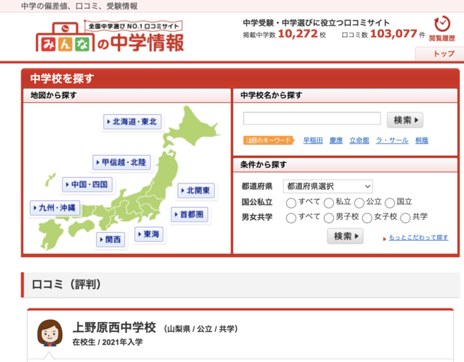 掲載中学校数が10,000校以上、口コミ数が100,000件を超える日本最大級の中学校口コミサイトであり、お住まいの地域から気になる中学校を検索できます。