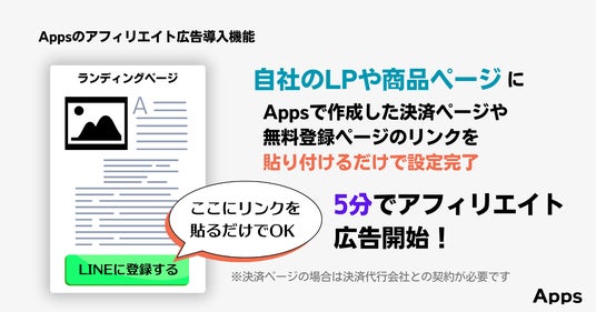 ■Appsのアフィリエイト広告導入機能の特徴Appsアフィリエイト広告導入機能の最大の特徴は「既に商品ページを持っていればすぐにアフィリエイト広告による集客を開始できる」その手軽さです。プログラミングの知識などは一切必要ありません。