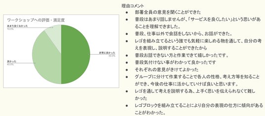 TanoBa社に企画頂いたレゴ(R)シリアスプレイ(R)メソッドのワークショップでは、役割や勤務年数、更に年齢も多様なメンバーでも、分け隔てなく和気あいあいと、意見を共有し合え、チームビルディングとして非常に有効だったと感じています。