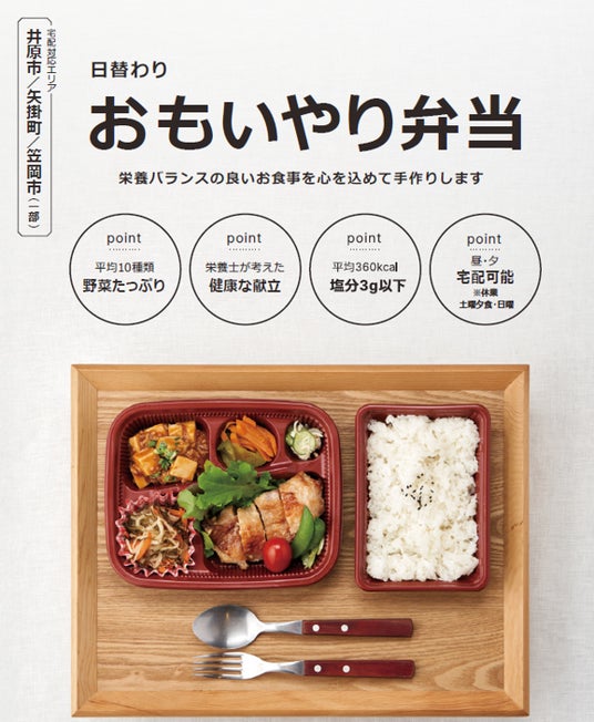 「おもいやり弁当」は、2011年にサービスを開始し、専属の管理栄養士がレシピを考案するカロリーや塩分に配慮した日替わり宅配弁当、および和洋両方の経験のあるシェフのオリジナル味付けの仕出し弁当です。ご高齢・一人暮らしの日々の食事にくわえ、町内会・親戚の集まり、更には企業の社員の昼食や研修・会議の際など、多くの方々に様々な用途で利用いただいています。