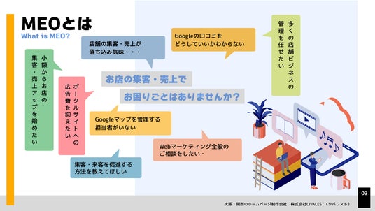 MEO対策代行サービスの概要資料を無料でダウンロードできます。店舗事業者様の集客・売上をアップするためのサービス資料となっています。