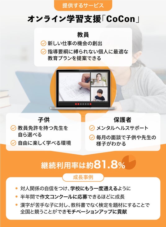 弊社は、「全ての子どもたちに平等な学習機会を」を企業理念に、不登校児童のためのプロ教員によるオンライン学習支援サービス「CoCon」を2023年6月にリリースしました。このサービスは、児童の成績アップを目的とせず、学ぶことの楽しさを感じてもらうことをゴールにしています。