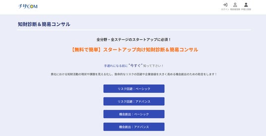 https://chizacom.iprich.jp/diagnosticサービスの詳細知財診断&簡易コンサルツールでは、無料でかつ数分程度の情報の入力により、スタートアップの知財に関する活動や認識の診断・評価・助言を受けられます。