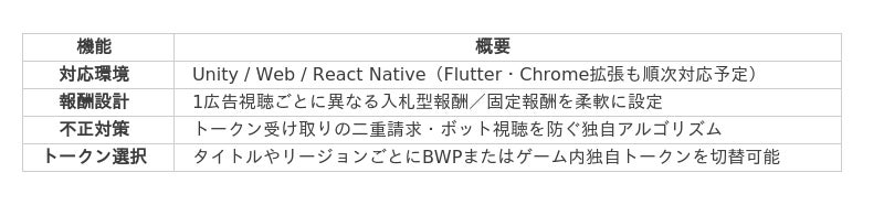 blocksky Inc.は、Unity専用の広告報酬SDK「W3AP Ad SDK」を正式リリースしました。本SDKをUnityプロジェクトに組み込むだけで、プレイヤーは動画広告を視聴するたびに BWP もしくはタイトル独自のERC-20トークンを即時に受け取ることができます。開発者は広告収益に加え、トークン経済による LTV向上 を同時に実現できます。