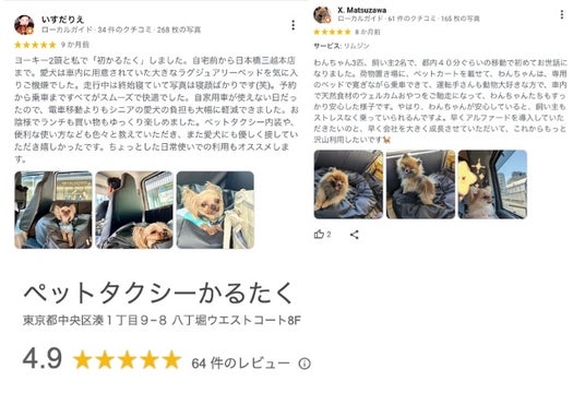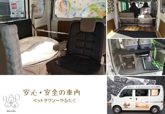 肩身の狭い思いをせず、ペットも飼い主も快適に移動ができるタクシーが必要だという想いから2023年3月よりペットタクシーかるたくのサービスがスタート。約1年間で乗車回数は1800を超えており、今後さらにペットタクシーを必要としている方にサービスを届けたい。と代表は語る。(現在所有台数5台)