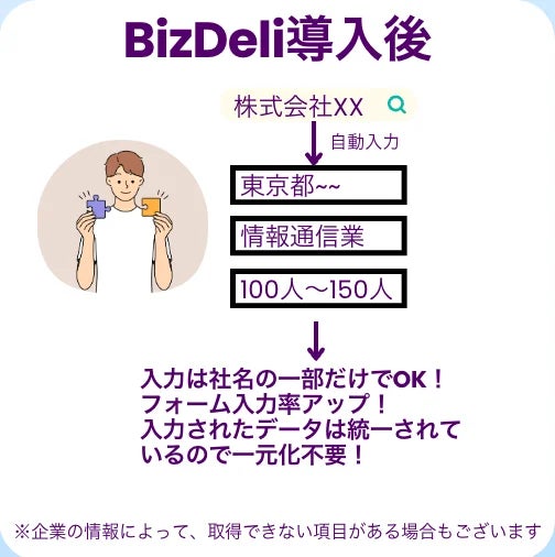 BizDeliは企業名の一部を入力するだけで、その企業の会社情報をフォームに自動入力することができるサービスです。
