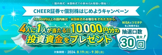 取扱開始を記念いたしまして、国内株式店頭取引・米国株式店頭取引で10,000円以上お買付の方に、抽選で4人に1人1万円分の投資資金が当たる「CHEER証券で個別株はじめようキャンペーンキャンペーン」を2024年8月19日(月)から開催いたします。