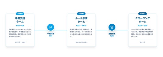 今期は、この実績を超える成果創出を目指し、支援体制を大幅に強化しました。 まず「事業支援ターム」にて20社を採択し、ルール形成に向けた戦略策定を支援。その後、審査を通過した有望な9社を最終採択し、専門家による本格的なルールメイキング伴走支援を行います。より多くのスタートアップに機会を提供しつつ、見込みのある事業にはリソースを集中投下することで、確実な社会実装を狙います。