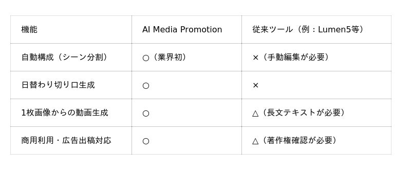 「AI Media Promotion」は、従来のテンプレートベースや短尺編集ツールとは一線を画す、