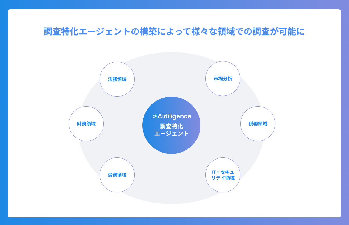 Aidiligenceの根本技術としては、一般的な法務や財務DDなどの特定領域に特化したものではなく、企業の事業内容などに幅広く調査実行を行えるような複数推論エージェントを構築しております。そのため、法務・財務DDに加え、企業情報を基にした初期的なビジネスDDやIT/セキュリティDDなど幅広い領域の調査実行を迅速に行うことができます。