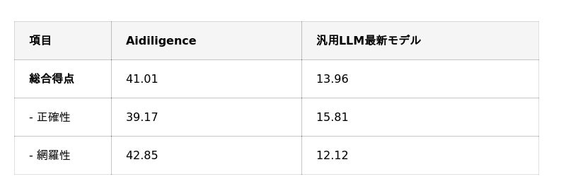 実際のM&Aを想定した架空の企業に対して、実際の専門家が法務・労務に関するDDとして指摘される調査事項を正解とし、対象企業のファイル群を与えた上でAidiligenceと汎用LLMの最新モデルAPIの出力を以下の評価軸にて採点を行いました。