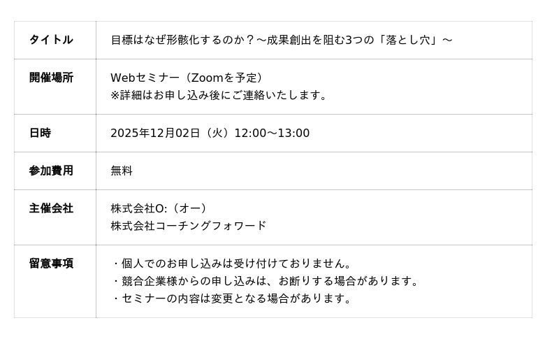 2025年12月2日、株式会社コーチングフォワード(本社:東京都中央区、代表取締役CEO:相川貴志)は、株式会社O:(オー)代表取締役 谷本潤哉氏と合同で、人事や管理職向けのセミナーを開催いたします。