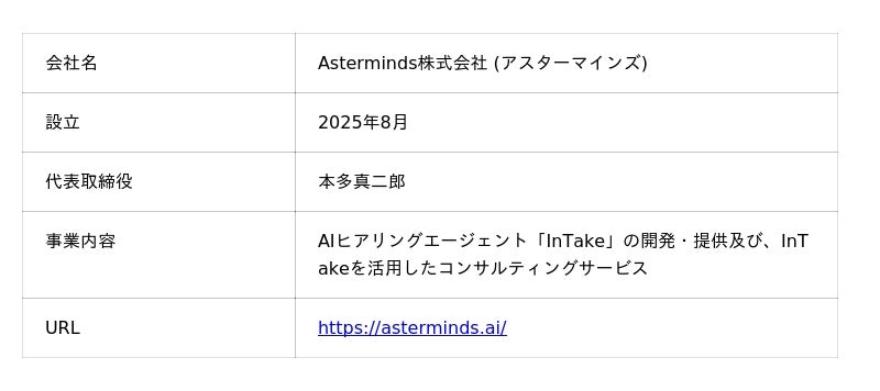 AIが処理できる情報は増えても、そこに流し込む一次情報(コンテキスト)の収集がボトルネックとして残り続けています。Astermindsは、この「情報のインテーク(取り込み)」という構造的課題を解くために、AIヒアリングエージェント「InTake」を開発・提供しています。