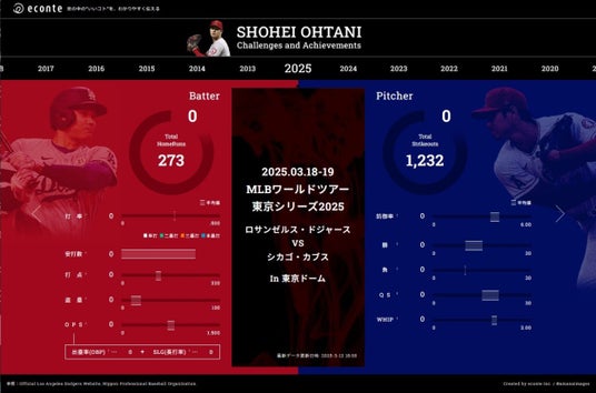 情報設計とクリエイティブで世の中の「いいコト」をわかりやすく伝える株式会社エコンテ(本社:東京都渋谷区、代表取締役:滝日伴則、以下「エコンテ」)は、ロサンゼルス・ドジャースの大谷翔平選手の「挑戦と軌跡」の体験型インフォグラフィック(動的なWebコンテンツとして表現)を制作・公開しました。
