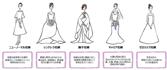 本調査サンプルを対象に生活価値観・結婚意識に関する64項目を用いて因子分析を行い、以下5つの高感度花嫁クラスターを導出。