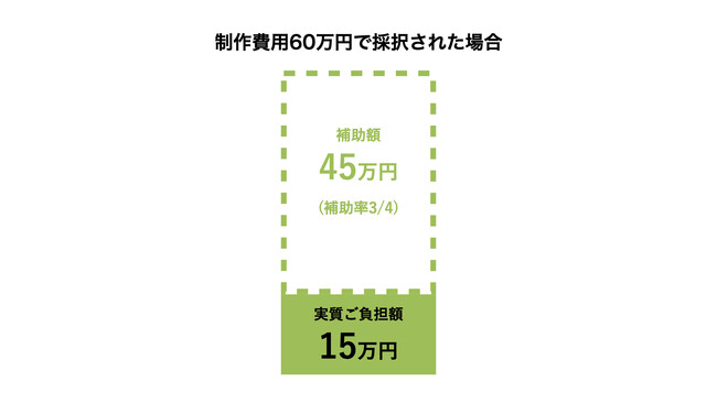 制作費用(補助金対象経費)60万円(税抜)の場合、採択されると45万円が補助されるため、実負担15万円で本格的なECサイトの導入が可能になります。