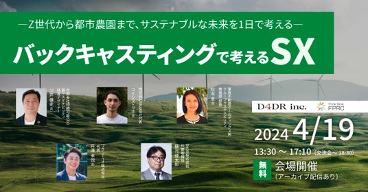 ディー・フォー・ディー・アール株式会社(本社:東京都港区、代表取締役社長:藤元健太郎、以下D4DR)の未来予測専門シンクタンク部門である「Future Perspective Research Center」(以下FPRC *1)は、2024 年4月19日に「バックキャスティングで考えるSX―Z世代から都市農園まで、サステナブルな未来を1日で考える―」と題した無料イベントを開催します。