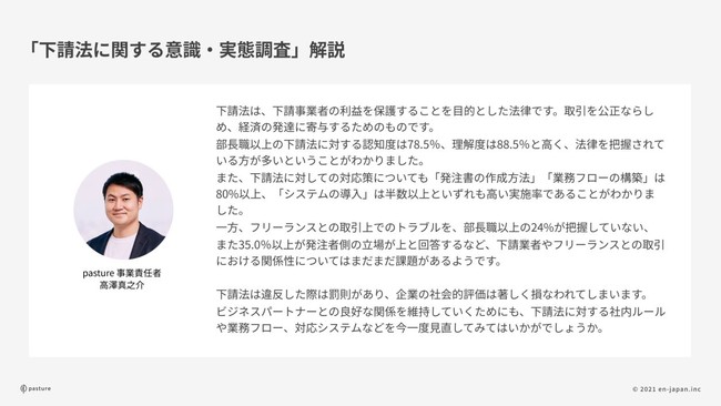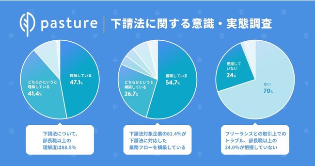 pasture(パスチャー)下請法対象企業の81.4%が下請法に対応した業務フローを構築と回答。一方、フリーランスとの取引上でのトラブルを、部長職以上24.0%が把握していないという結果に。