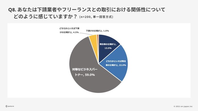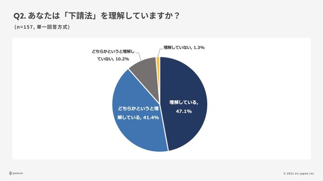 人材採用・入社後活躍のエン・ジャパン株式会社(本社:東京都新宿区、代表取締役社長:鈴木孝二)が運営するフリーランスマネジメントシステム「pasture(パスチャー)」(https://www.pasture.work/ )は、全国のビジネスパーソン200名を対象に、「下請法に関する意識・実態調査」を実施いたしました。