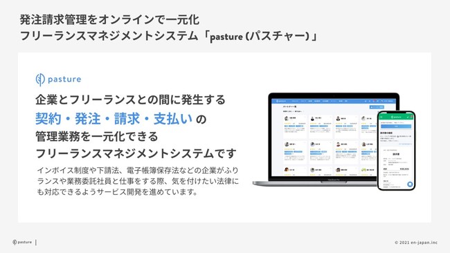 pasture(パスチャー)とは企業とフリーランスとの間に発生する契約・発注・請求・支払いの管理業務を一元化できるフリーランスマネジメントシステムです。