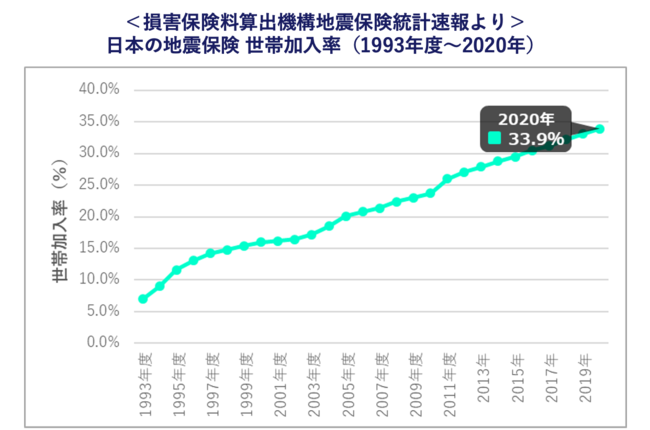 損害保険料算出機構の地震保険統計速報によれば2020年の日本の地震保険世帯加入率は33.9%と、1993年度の7.0%から27年連続で増加しています。