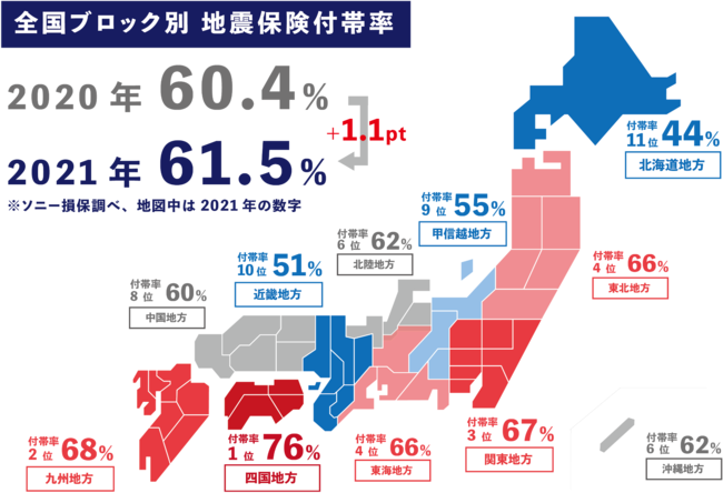 (損害保険料率算出機構「地震保険 世帯加入率」) また、火災保険を契約する持ち家世帯における地震保険の「付帯率」も同様に増加傾向にあり、ソニー損保が2020年~2021年にかけて、全国の火災保険に加入している持ち家世帯を対象に行った調査