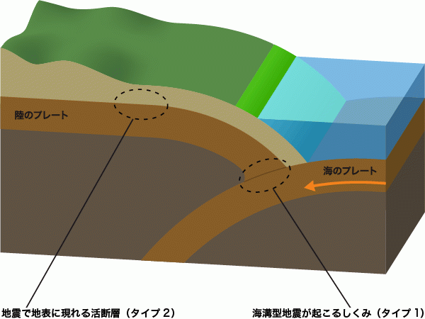 ・海と陸のプレート境界でおきる地震が「海溝型地震」(タイプ1)、陸のプレート内の弱い場所がずれて起こる地震が「活断層による地震」(タイプ2)。