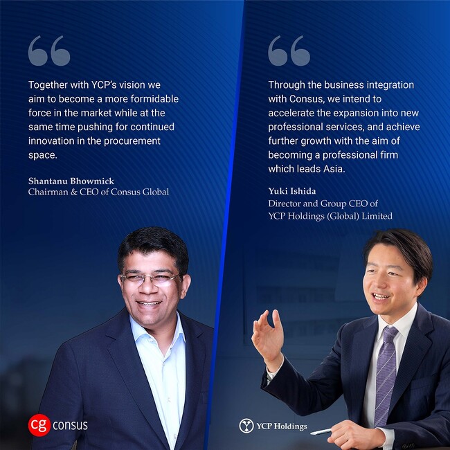 2023年4月、YCPホールディングス(本社:シンガポール、取締役兼グループCEO :石田裕樹)は、当社グループの中核事業であるマネジメントサービス事業部及び新設するサプライチェーン・ソリューションズ事業部の事業強化を目的として、世界7拠点で調達・サプライチェーンに関連する支援を手掛けるコンサルティングファームConsus Global (以下、「コンサス」と言います。)の発行済株式を100%取得し完全子会社化する契約を締結しましたのでお知らせいたします。