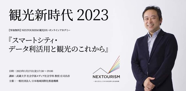2023年1月27 日(金)17時半からオンラインで開催される本アカデミーには、講師として、武蔵大学 社会学部メディア社会学科 教授で、当機構のアドバイザリーボードでもある、 庄司昌彦氏をお迎えします。急速に動き始めたデジタルガバメント化・スマートシティ化、データ活用の観点から、ポストコロナ時代の観光についてお話し頂きます。