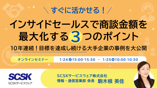 SCSKサービスウェア株式会社(本社:東京都江東区、代表取締役社長:渡辺 篤史)は、インサイドセールスにおいて10年連続で目標達成した事例から、そのノウハウを紹介するオンラインセミナー「すぐに活かせる!インサイドセールスで商談金額を最大化する3つのポイントー10年連続!目標を達成し続ける大手企業の事例を大公開ー」を2023年1月24日(火)、2023年1月25日(水)の2日間開催する。*いずれの日程も同内容