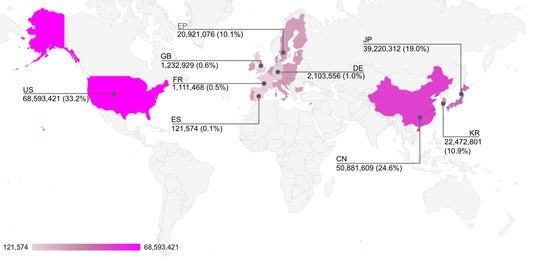 現時点で、US、EP、JP、KR、CN、GB、DE、FR、ES、を対象としています。分析対象とした特許(現在アクティブなもの及び非アクティブなものを含む)は