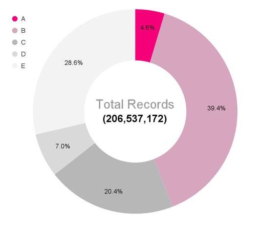 当社の試算によると、特許侵害度が最高位である「A」とレーティングされるレコード(特許と侵害製品候補の組み合わせ)の数は 約9,549,000 (総数に対し4.6%)件となります。