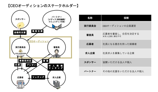 CEOオーディションでは、『人は誰でも社長になれる』というメッセージにご賛同いただき、共に意志や情熱ある方を社長人材へと成長させてくださるスポンサー・パートナーを募集しています。CEOオーディション実行委員会とともに本企画を盛り上げていただけたら幸いです。