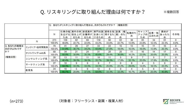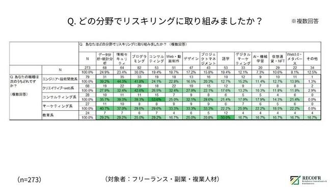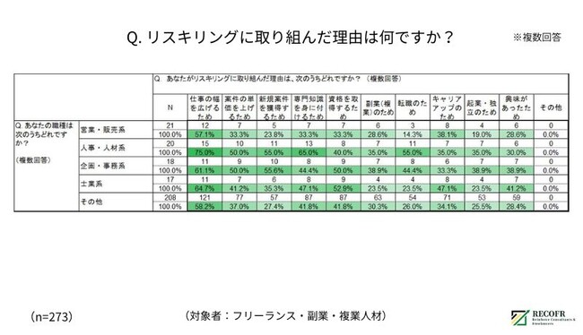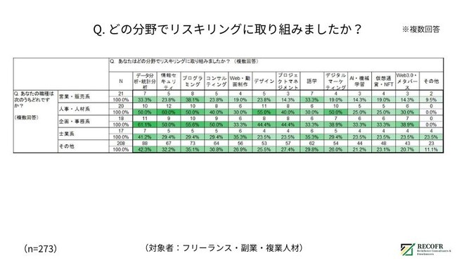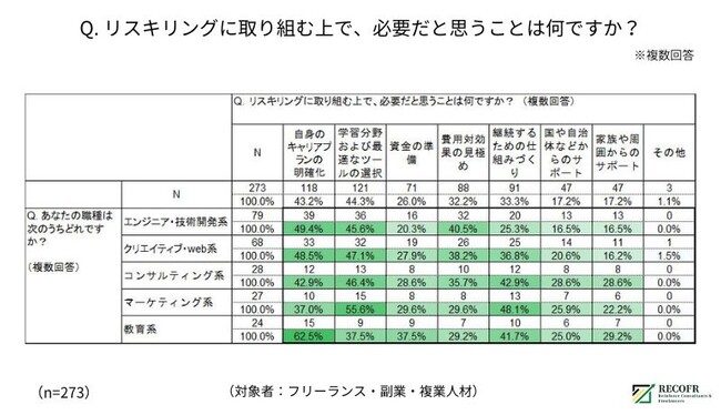 この結果から、どの職種においても、まずは自身のキャリアプランを明確にし、目標を定めた上でリスキリングに取り組むことが大切であると分かります。また当アンケートの対象者でもあるフリーランスや副業(複業)人材は、会社員のように組織的な研修やメンター制度が整備されていないため、自ら学ぶ環境を整え、継続するための仕組みを作ることが重要です。