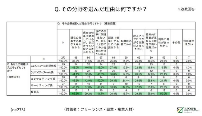 「リスキリングに取り組んだことがある」と回答したフリーランス・副業・複業人材のうち、最も多かった職種は「エンジニア・技術開発系(15.5%)」で、次に「クリエイティブ・Web系(13.3%)」が続きました。