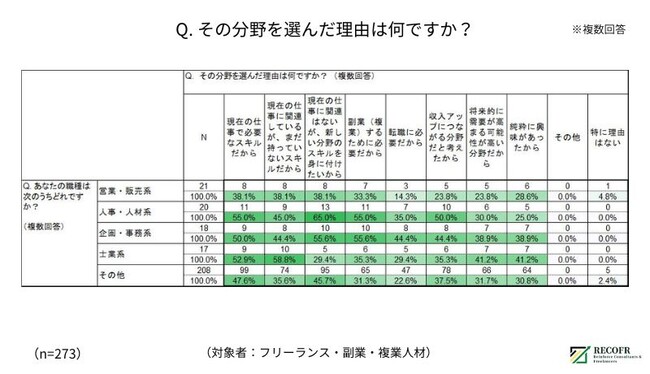 その他の特徴として、「副業(複業)」を理由に挙げた方は「クリエイティブ・Web系」に多く36.8%でした。Web系の副業は初期投資が比較的少なく、会社員でも取り組みやすいことから近年注目を集めており、今後もさらに増加することが予想されます。