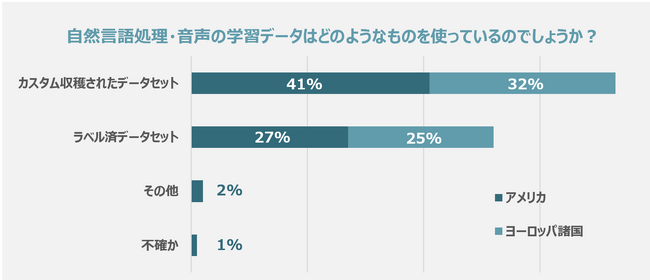 ●自然言語処理(NLP)、音声の学習データによる音声アシスタントは自動運転の安全性をさらに向上 AIを搭載した音声アシスタントは、車両のセンサー情報と組み合わせたリアルタイムのデータを活用し、ドライバーに情報を提供するための文脈に沿ったアプリケーションで、車室内のデジタル機能を強化することができます。回答者のうちアメリカでは41%、ヨーロッパでは32%がカスタム収集されたデータセット、27%と25%はラベル済のアノテーションされたデータセットをNLP、音声の学習データに使用していると回答したことから、各地域それぞれ約7割と約6割がAIによる社内の快適性、安全性のためにデータセットを活用していることが分かりました。