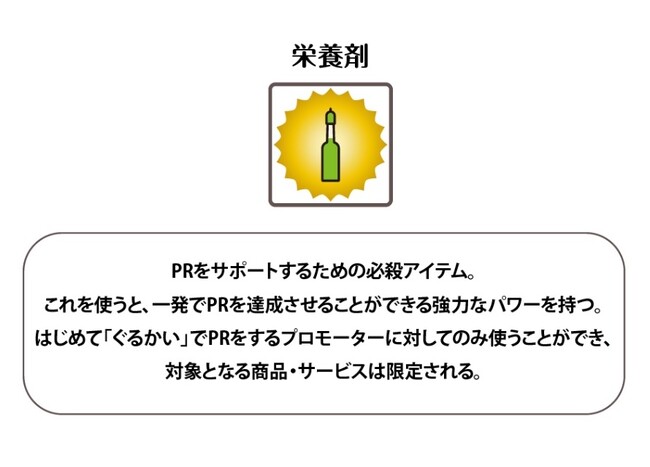 「栄養剤」はそのアイテムの一つで、第三者のはじめての「ぐるかい」でのPR活動を一発で達成させることができる強力なサポートアイテムです。入手したら、まだ「ぐるかい」未経験のお友達を誘ったり、SNSでサポートを求めている方に対して使用してみましょう。
