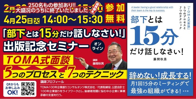 TOMAコンサルタンツグループ(本社:東京都千代田区丸の内、代表取締役会長 藤間 秋男/代表取締役社長 市原 和洋)の会長 藤間は、「TOMA式面談」5つのプロセスと7つのテクニックを大公開する『部下とは15分だけ話しなさい!』出版記念セミナーを4月25日(火)14:00~15:30 無料オンライン開催します!