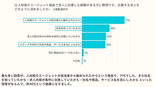 3. 人材紹介会社利用者の7割以上が応募する企業を選ぶ理由は「エージェントに勧められたから」人材紹介エージェントの担当者から勧められて求人応募をしている方が多いことから、エージェント担当者に自社を認知してもらい、候補者に紹介してもらうことが重要だと言えます。また会社やサービスを知っていたことが応募きっかけになっていることから、日々の広報活動が採用に影響を与えていることが分かります。